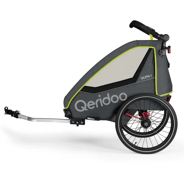 Unbeschwerte Familienausflüge an sonnigen Tagen sind mit dem Qeridoo QUPA1 gesichert. Neben dem Zusammenspiel der wichtigsten Komponenten, Sicherheit und Komfort, besticht vor allem der Anhänger durch seine aerodynamische Form und das sportliche Design. Er vereint die wichtigsten und beliebtesten Funktionen, wie das Blattfeder-Dämpfsystem, welches unebene Stellen gekonnt ausgleicht und somit für maximalen Fahrspaß sorgt. In Puncto Sicherheit bewährt der Anhänger sich durch den 5-Punkt-Gurt, die Hand-Feststellbremse und der höhenverstellbare Schiebegriff.